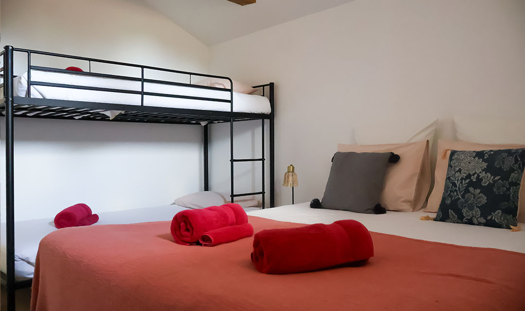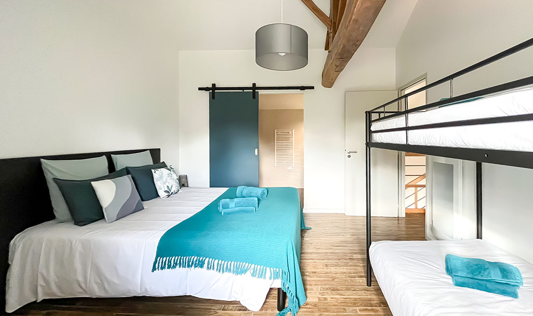 À l’étage, plusieurs configurations de couchages permettent d’accueillir confortablement jusqu’à 12 personnes.